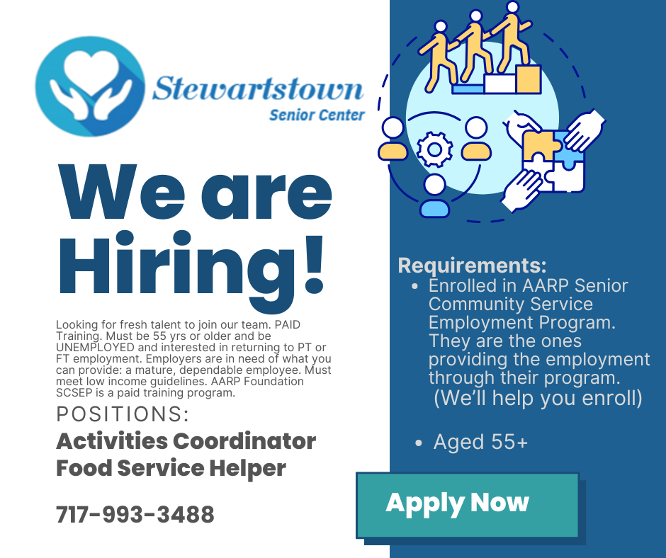 WE ARE HIRING through the AARP Foundation Senior Community Services Employment Program! PLEASE FOLLOW THE LINK FOR MORE INFORMATION! Employment Opportunity