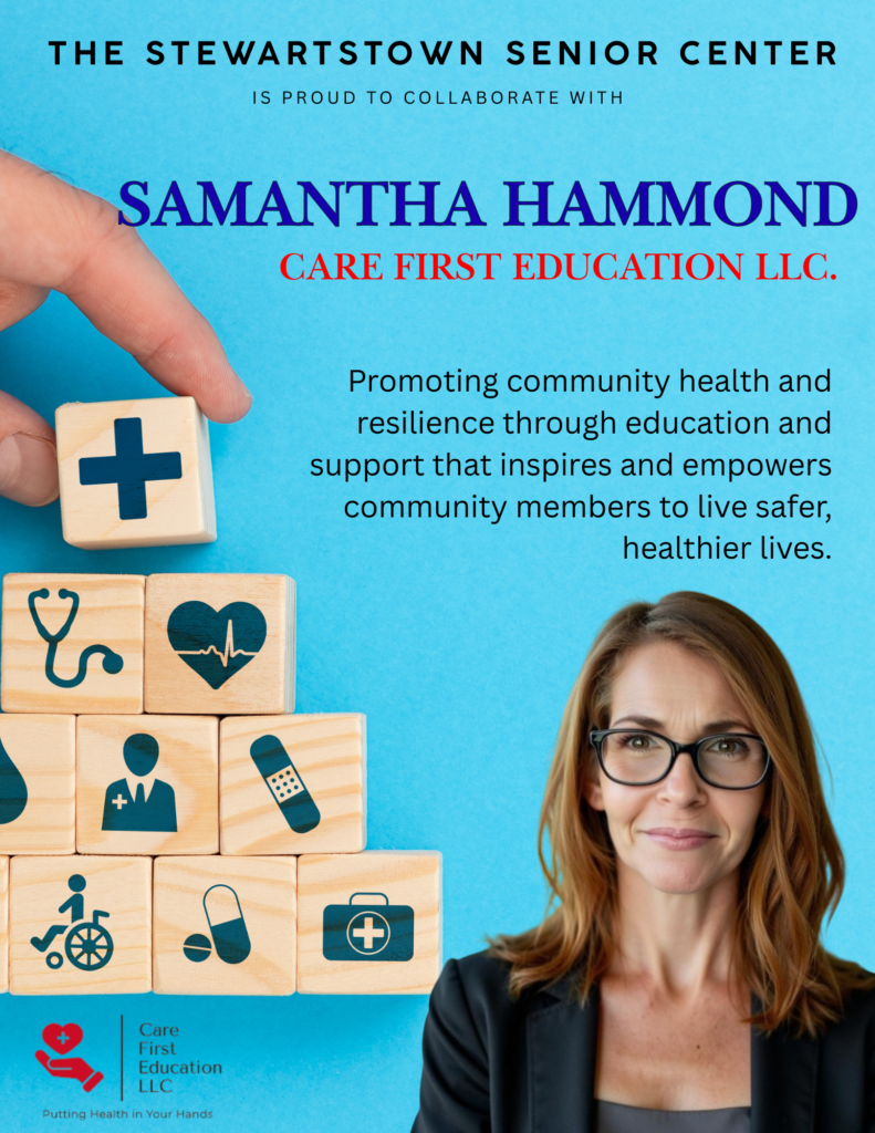 The Stewartstown Senior Center is proud to announce our collaboration with Care First Education LLC. Care First Education LLC is founded by local community member, Samantha Hammond. Samantha brings a valuable knowledge to our community. She has a graduate degree in Nursing and specialized training in health, safety, and preparedness with the real-world experience as a registered nurse in community settings, a nurse educator, and a Red Cross volunteer. Her background equips the organization to provide a community educational curriculum that focuses on the community and its health, wellness, and learning needs.